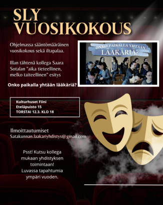 Viinin maistelua Vinko-Barissa sommelier Sara Tammelinin johdolla pe 16.1. klo 18 alkaen. Testaamme kuutta eri laatuviiniä ja niille räätälöityjä makupareja samalla, kun Sara kertoo juomien taustoja. Hinta 30 €/hlö. Avecit tervetulleita. Mukaan mahtuu vain 30 henkilöä! Ilmoittaudu pikaisesti satakunnan.laakariyhdistys@gmail.com. Toivetapahtumana jääkiekko-ottelu Assät-Lukko Isomäen jäähallissa pe 23.1. klo 17. Tapaaminen Pub Winstonissa klo 17. Yhden juoman ostamalla saa bussilipun Isomäkeen, SLY tarjoaa jääkiekkoliput. Pelin jälkeen omakustanteiset wingsit Rattiksessa. 2 paikkaa vielä, jos innostut! Ilmoittaudu pikaisesti satakunnan.laakariyhdistys@gmail.com. Vuosikokous Kulttuuritalo Fiinissä to 12.3. klo 18. Ohjelmassa vuosikokous, iltapalaa sekä Konsertti ja multimediaESITYS: Saara Sotala ( kollega, yleislääketieteen erikoislääkäri pääkaupunkiseudulta): Onko paikalla yhtään lääkäriä? Iltapalan vuoksi ilmoittautuminen satakunnan.laakariyhdistys@gmail.com. Tervetuloa valtavan upeaan paikkaan ja huikeaan esitykseen! Tulevaisuudessa tiedossa tietenkin "tiedettä ja teetä" . Tarkemmat tiedot tuonnempana! Seuraa meitä myös somessa! SLY on nyt myös Instagramissa #satakunnanlaakariyhdistys sekä facebookissa on ryhmä satakunnanlaakariyhdistys. Siellä on upeat mainokset tapahtumiin ja kuvia ja kommentteja tapahtumista. Ota seurantaan! Tarkempia aikatauluja tulee, kun asiat varmistuvat. SLY:n hallitukseen valittiin puheenjohtajaksi Tuomas Koskinen. Jäseniksi valittiin Johanna Haikonen, Anton Bondfolk, Teemu Joutsi, Laura Kyhä-Österlund, Raija Uusitalo-Seppälä, Jaana Lehtimäki. Uusiksi hallituksen jäseniksi valittiin Anu Bergendahl-Mansikka ja Iiro Heino. Kerro meille, mitä haluaisit yhteiseksi tekemiseksi, yritämme järjestää. |